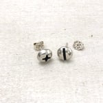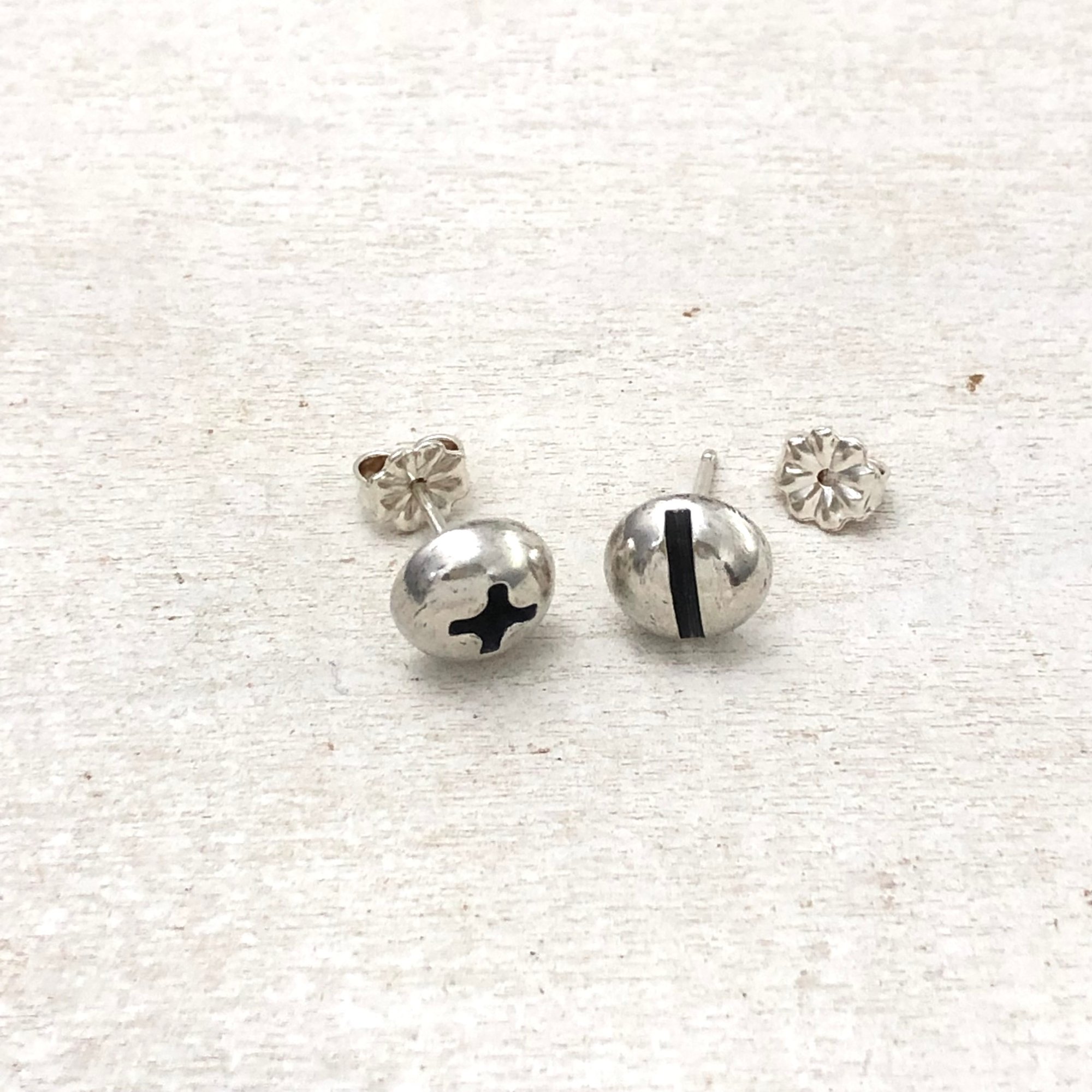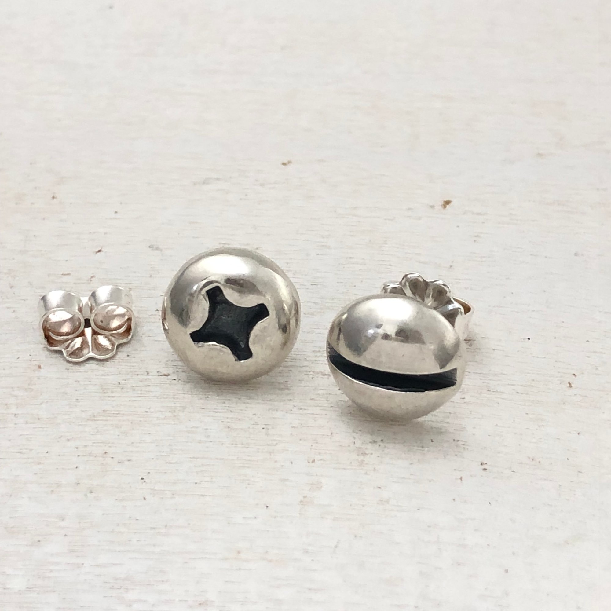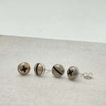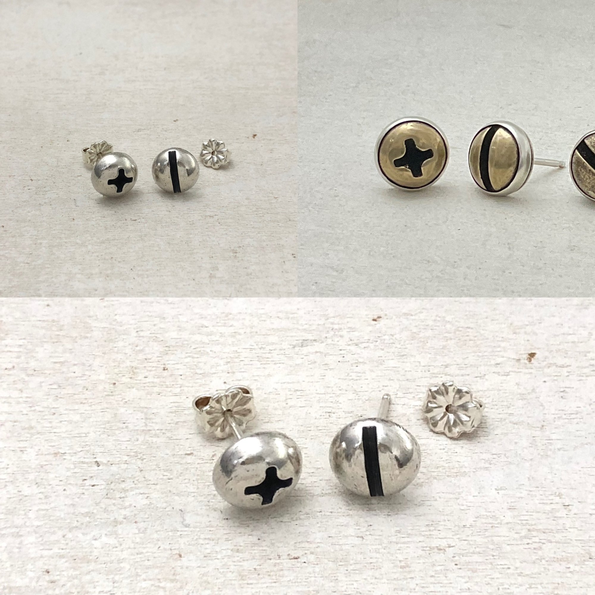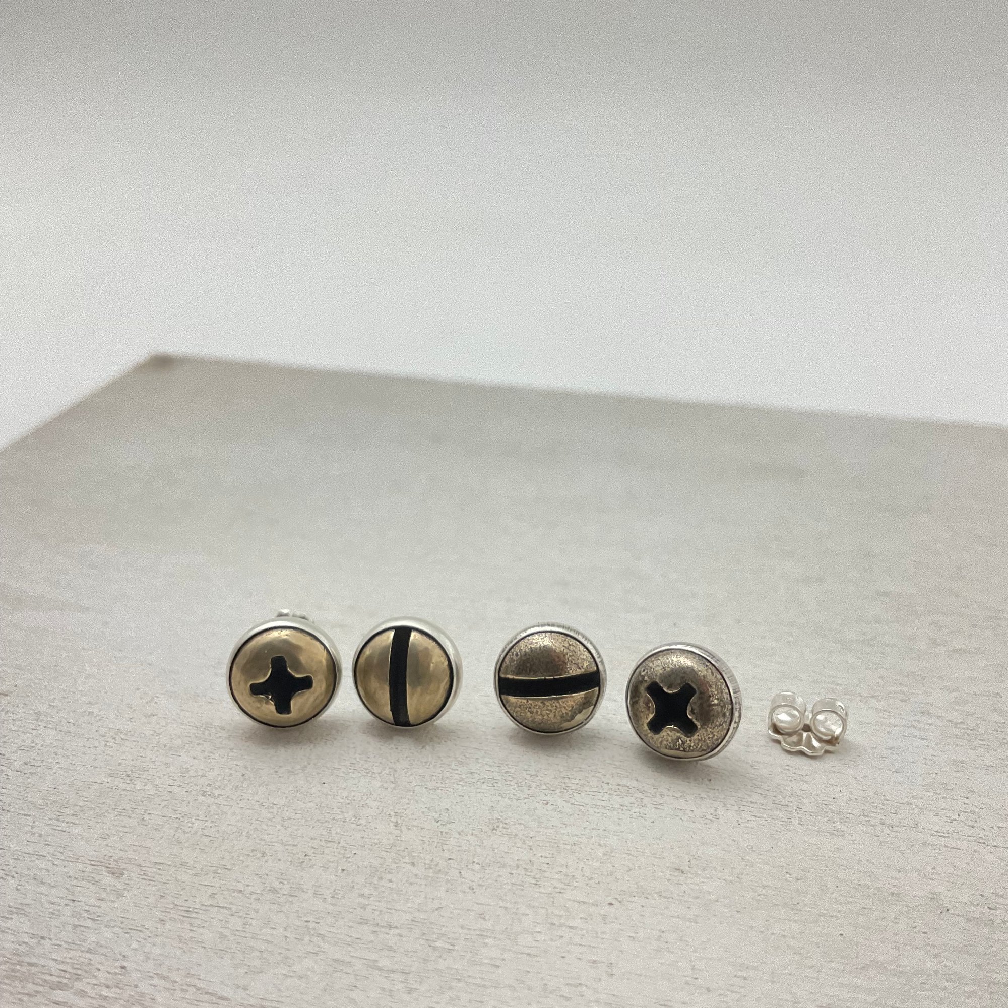 Round wood screws cast in silver or brass in a silver bezel. Both have silver posts and backs.